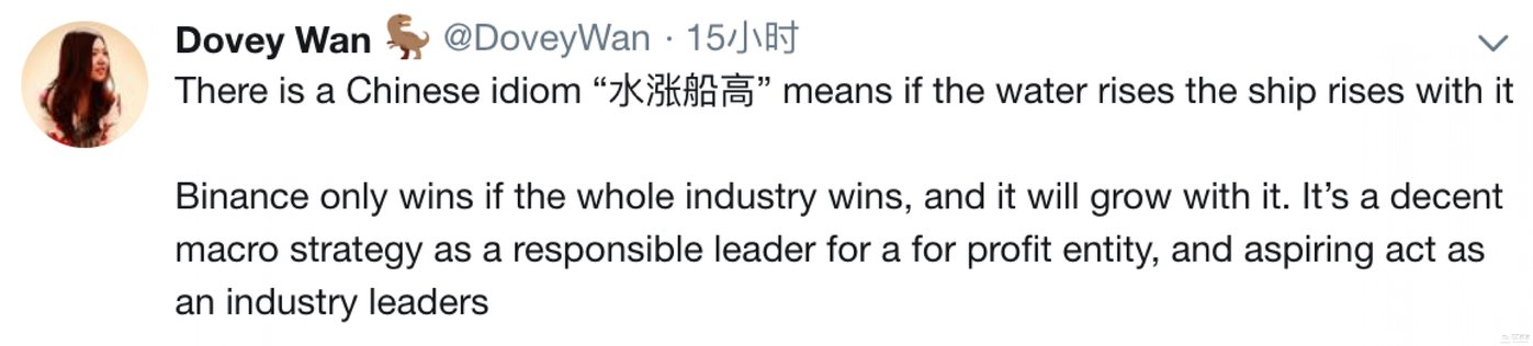 Primitive Ventures创始合伙人Dovey Wan发布推特表示:“用成语‘水涨船高’来形容,只有行业获胜币安才能获胜,只有行业增长币安才能增长。币安作为一个经济体的可靠领导者和一个有抱负的产业引领者,它的做法是个非常体面的宏观战略。”