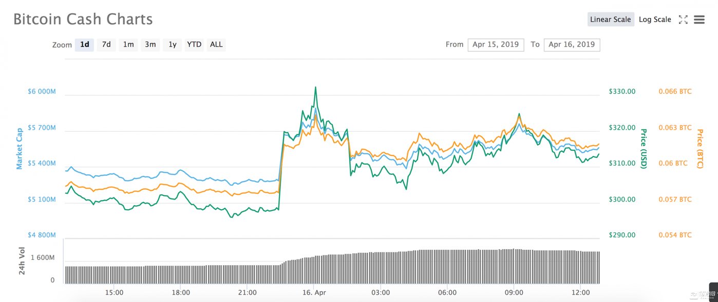 与此同时,BCH ABC则在20分左右启动上涨,一度突破330美元关口,最高到达332.27美元。今日上午震荡上升,现报313.87美元。